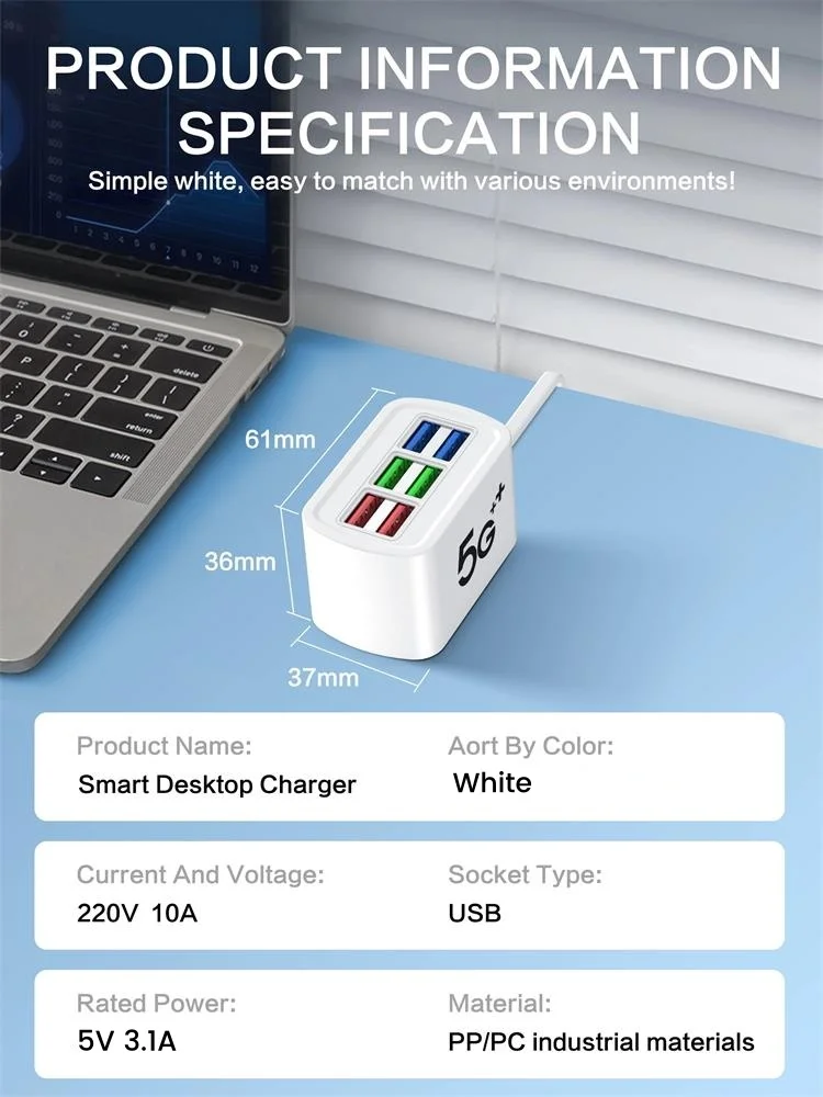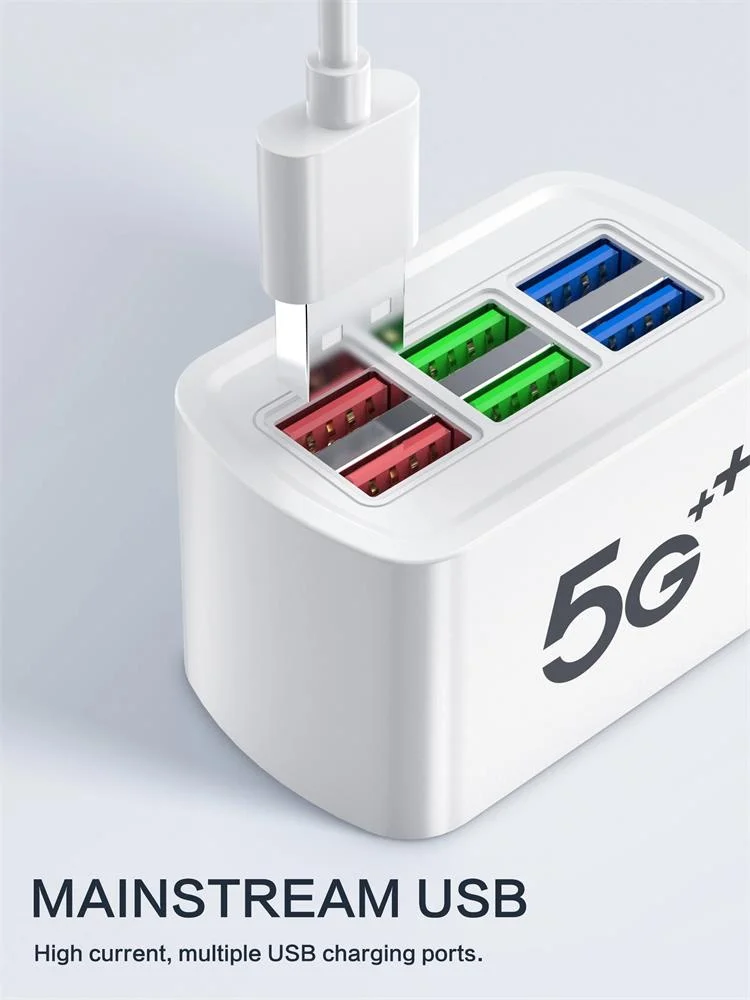 A power strip charger with 6 USB ports, equipped with both European and American plugs, capable of charging mobile phones