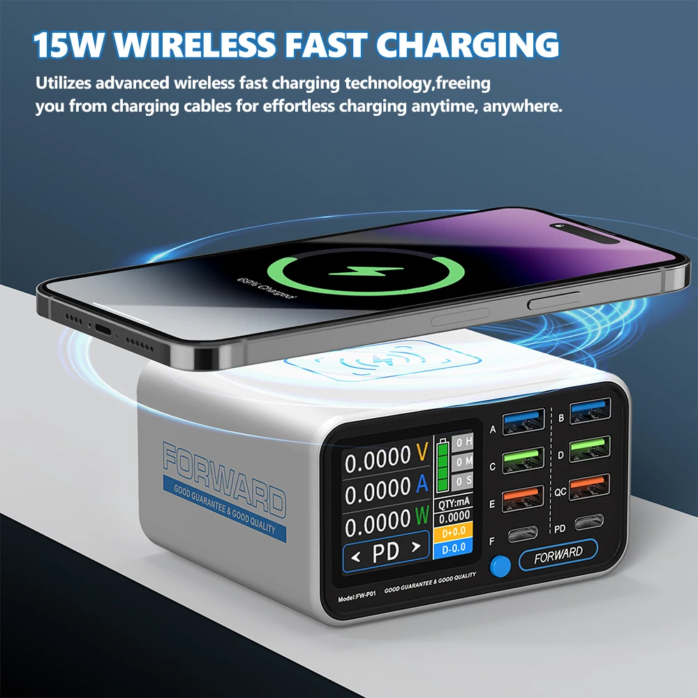 Meet the ultimate charging solution for multi-device users: the FORWARD FW-P01. With 8 USB ports, 15W wireless charging, and real-time monitoring, it keeps all your gadgets powered efficiently and safely. Perfect for home, office, or travel!