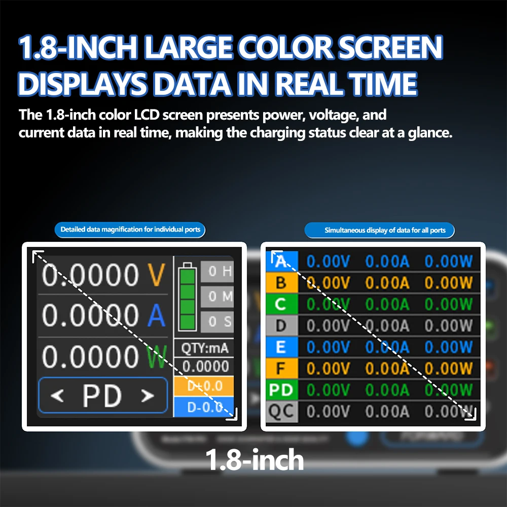 1.8-Inch Smart Display: Real-time voltage (V), current (A), power (W), and charging status—monitor each port’s performance with color-coded clarity!