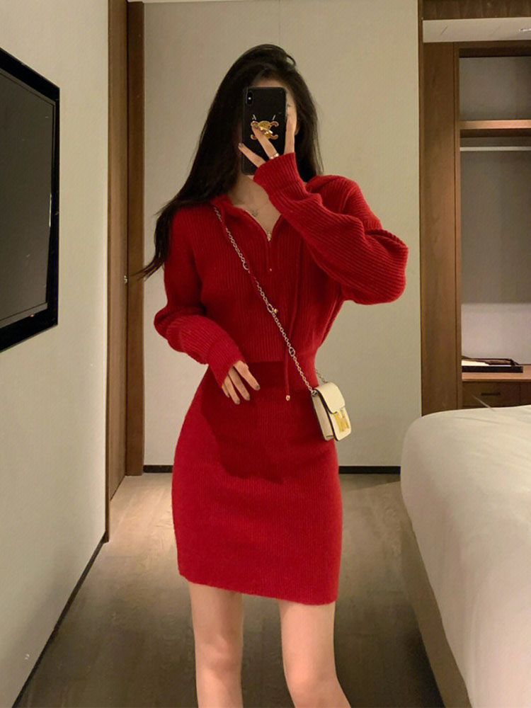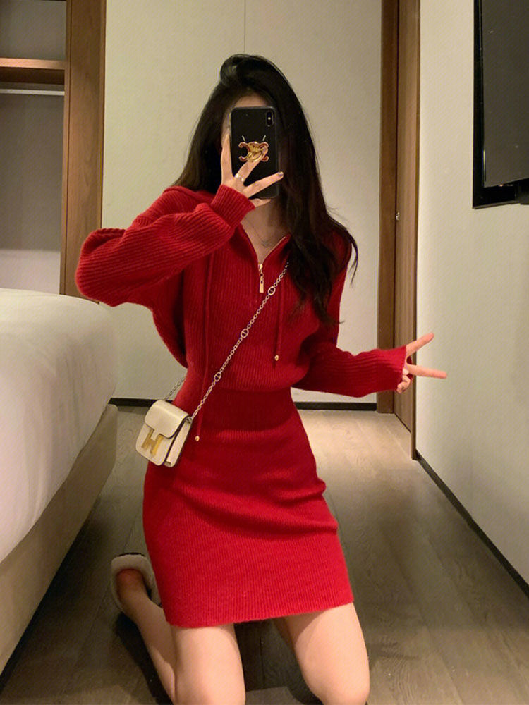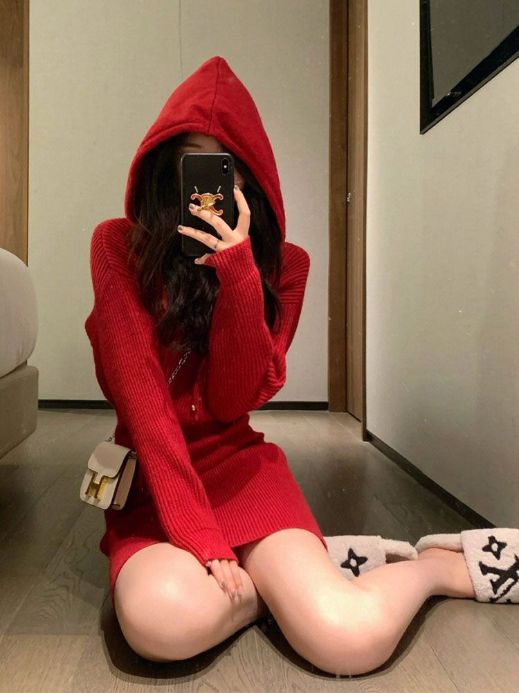 French New Year Red Hooded Knit Dress