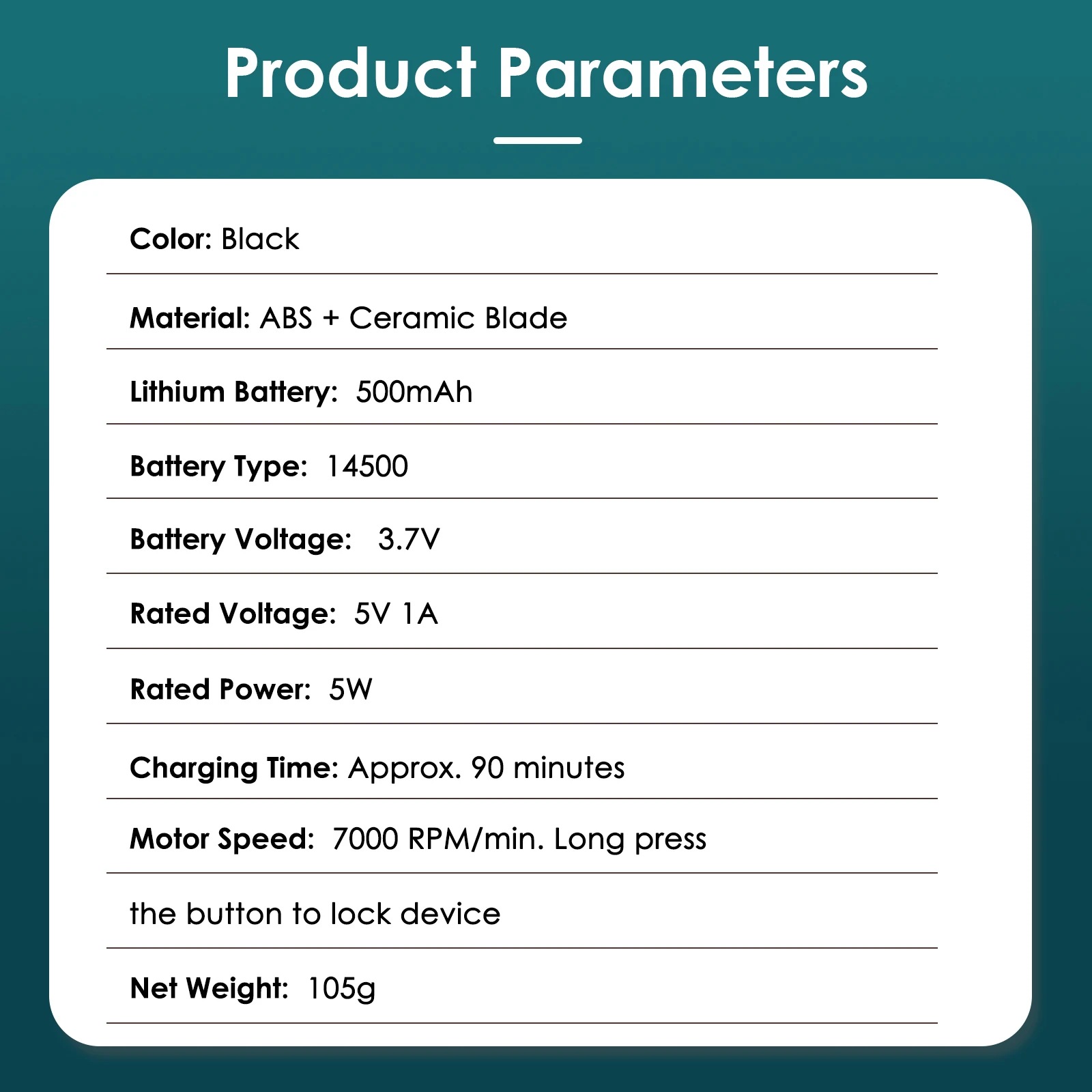 Motor Speed: 7000 RPM/min. Long press the button to lock device