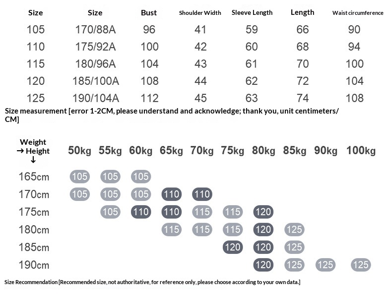 Sizes: 170/105, 175/110, 180/115, 185/120, 190/125