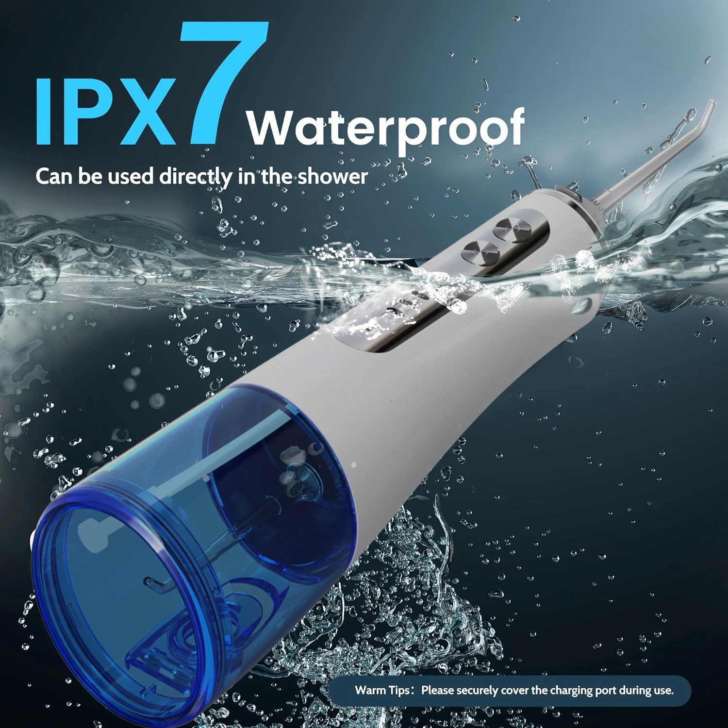 【WATERPROOF DESIGN】IPX7 waterproof design is adopted for both internal and external of the machine to provide dual protection, which prevents leakage and allows the water flosser to be used safely for shower in the bathroom.