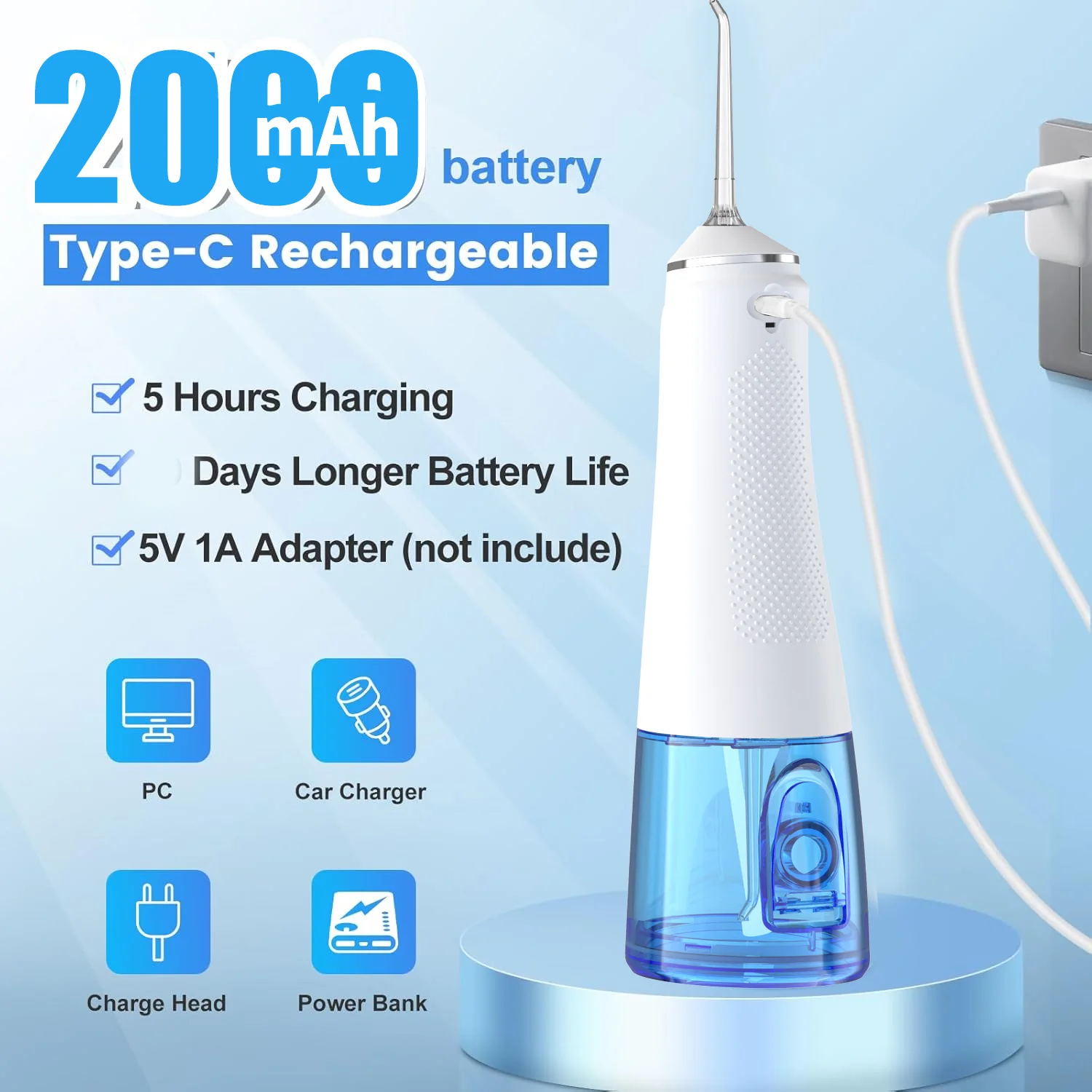 【LONG LASTING BATTERY】Rechargeable oral irrigator with powerful 2000Mah lithium battery is able to last for 45 days once fully charged. The USB interface charging is applicable to a power bank, phone charger and PC.etc.