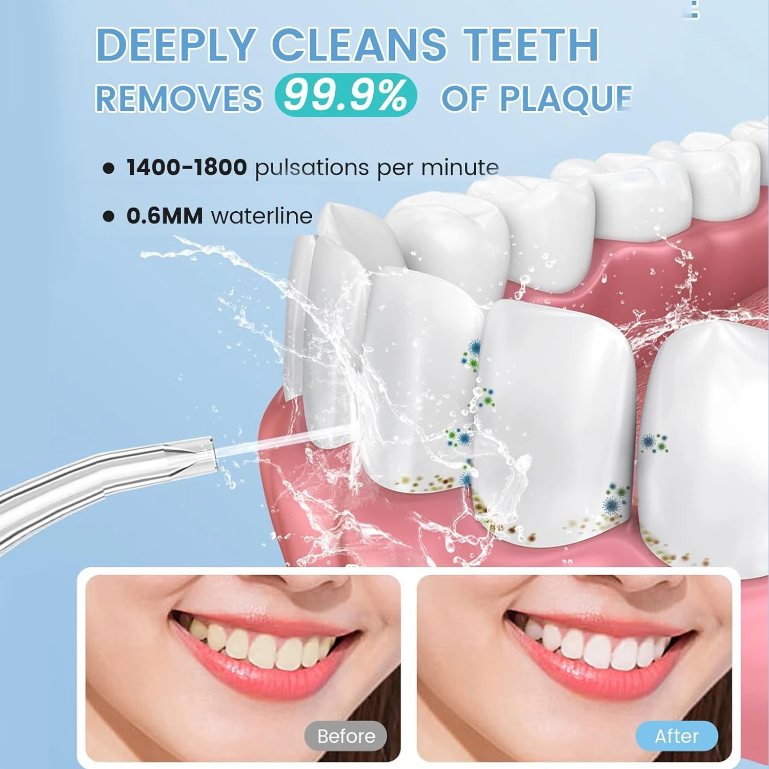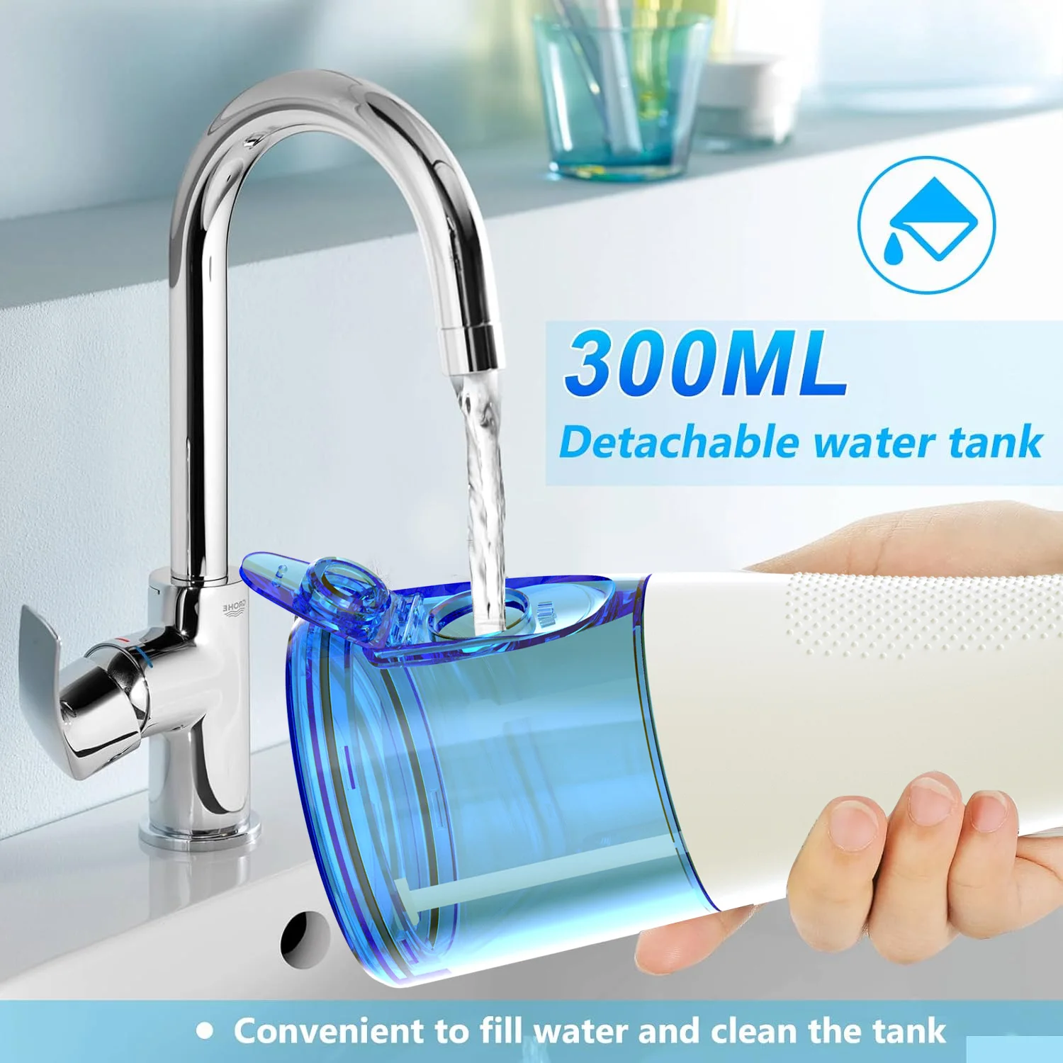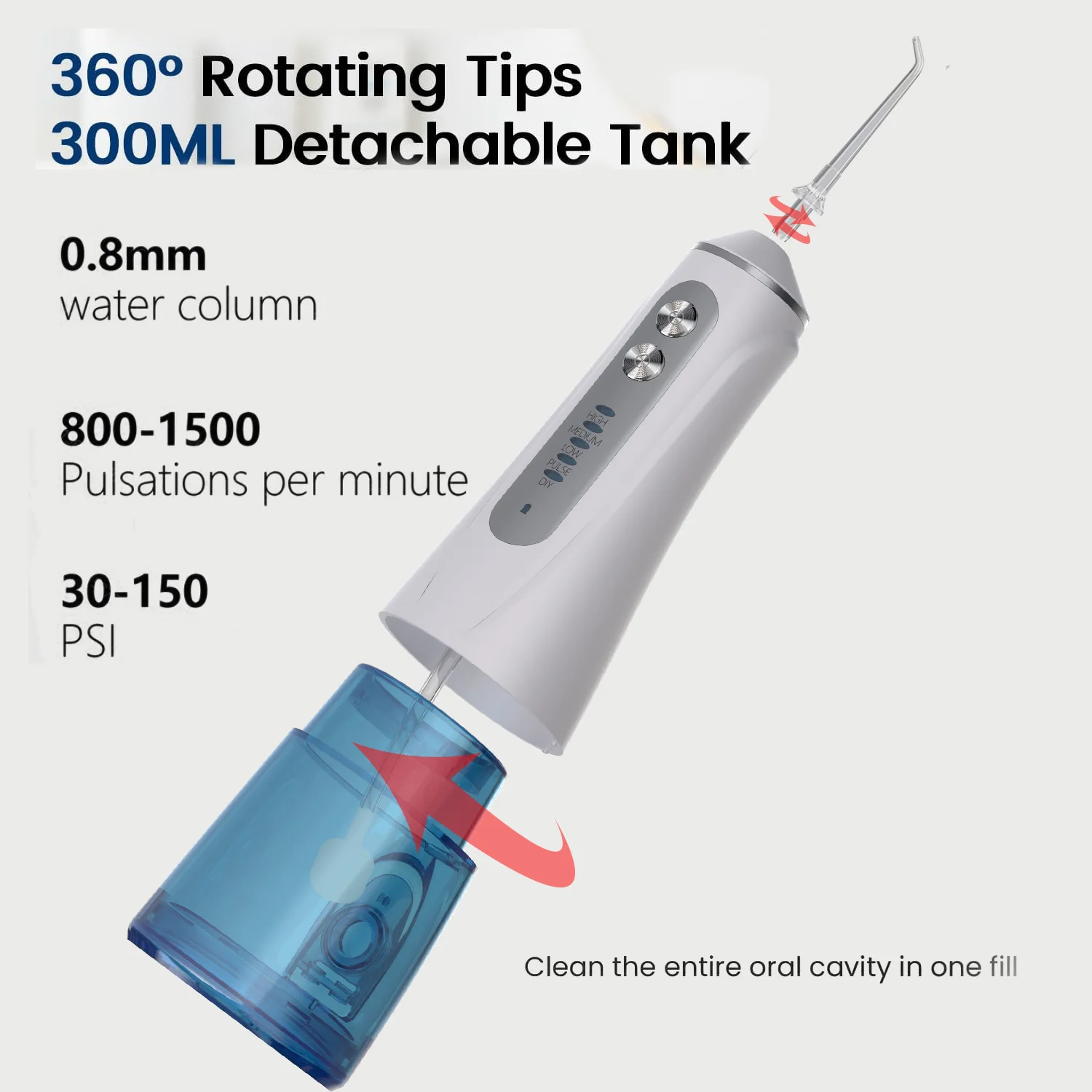 【300ml Detachable& Cleanable Water Tank】:300ml water reservoir perfect for enough and uninterrupted water dental pick teeth cleaner without filling in water again and again. The upgraded removable full-opening water tank allows you to thoroughly clean the limescale and dental teeth problem, which is impossible for common oral irrigators.