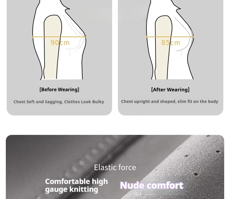 Features: Seamless, comfortable, helps contain the side bust to make larger busts appear smaller